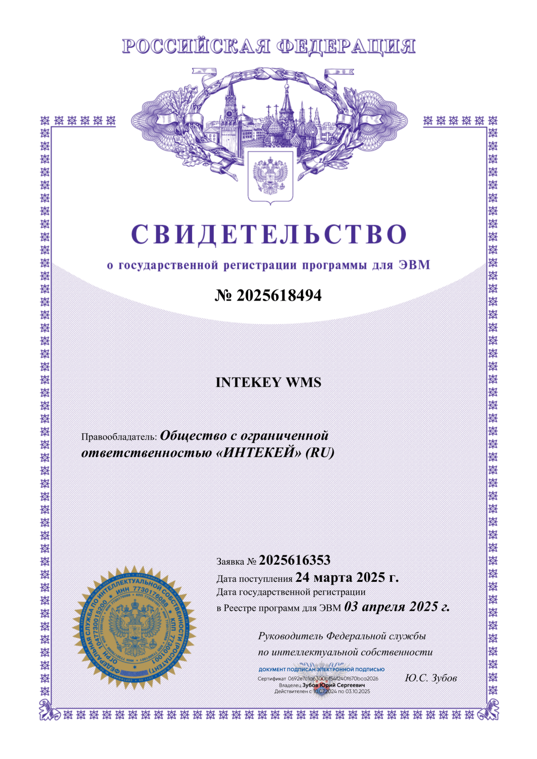Свидетельство о государственной регистрации программы INTEKEY WMS для ЭВМ